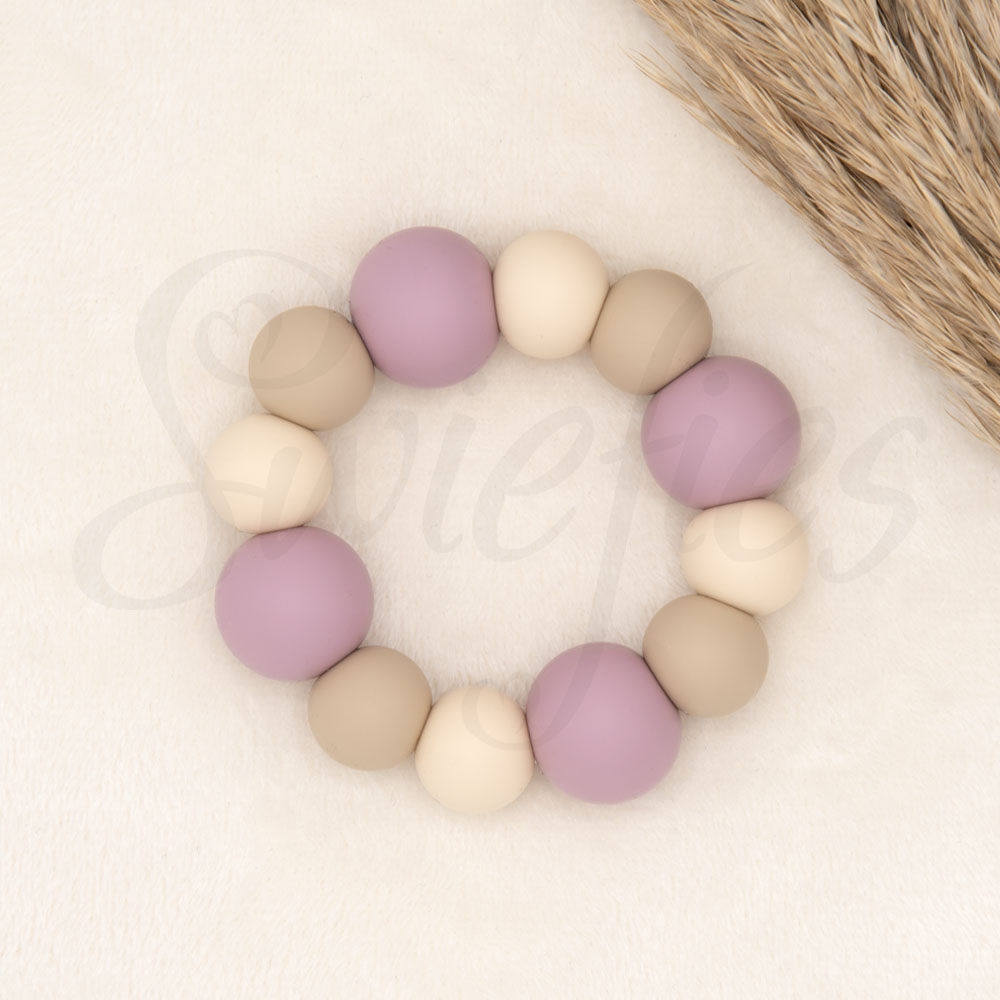 Een Swiefies bijtring is een uniek, stijlvol en veilig product dat de pijn bij doorkomende tandjes verzacht. De bijtring wordt in Nederland met de hand gemaakt van een stevig satijndraad en siliconen kralen.