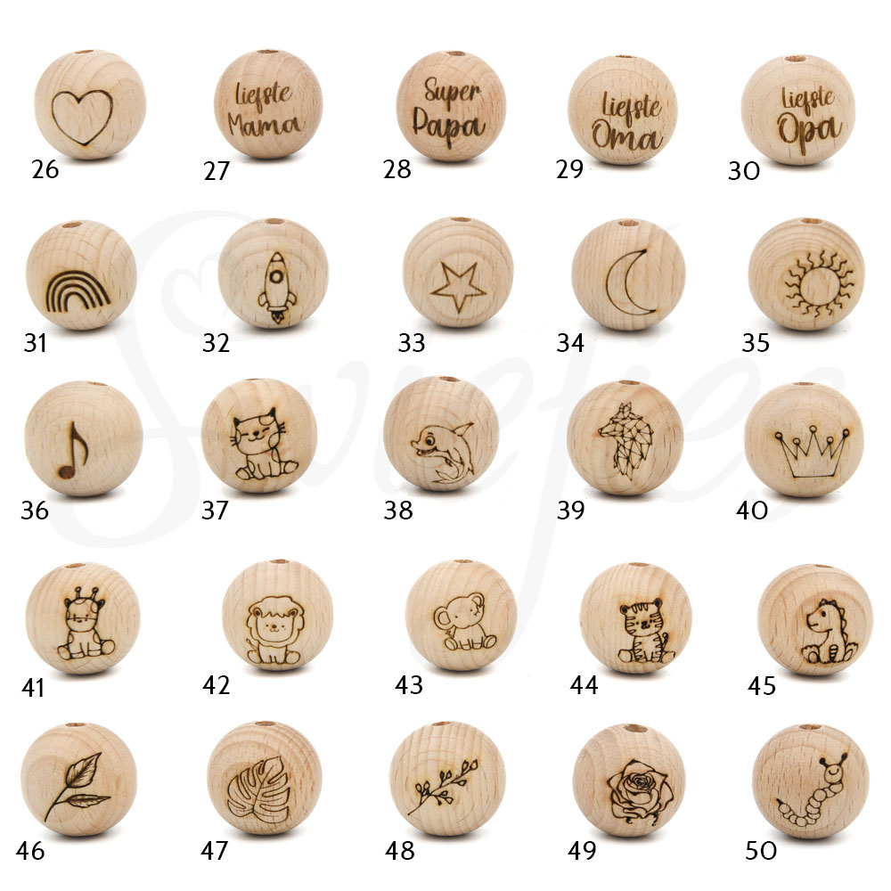 • Naam en kralen: Bij namen langer dan vier letters kunnen enkele kralen vervangen worden om aan de maximale veiligheidslengte te voldoen, zonder afbreuk te doen aan de stijl van het speenkoord.