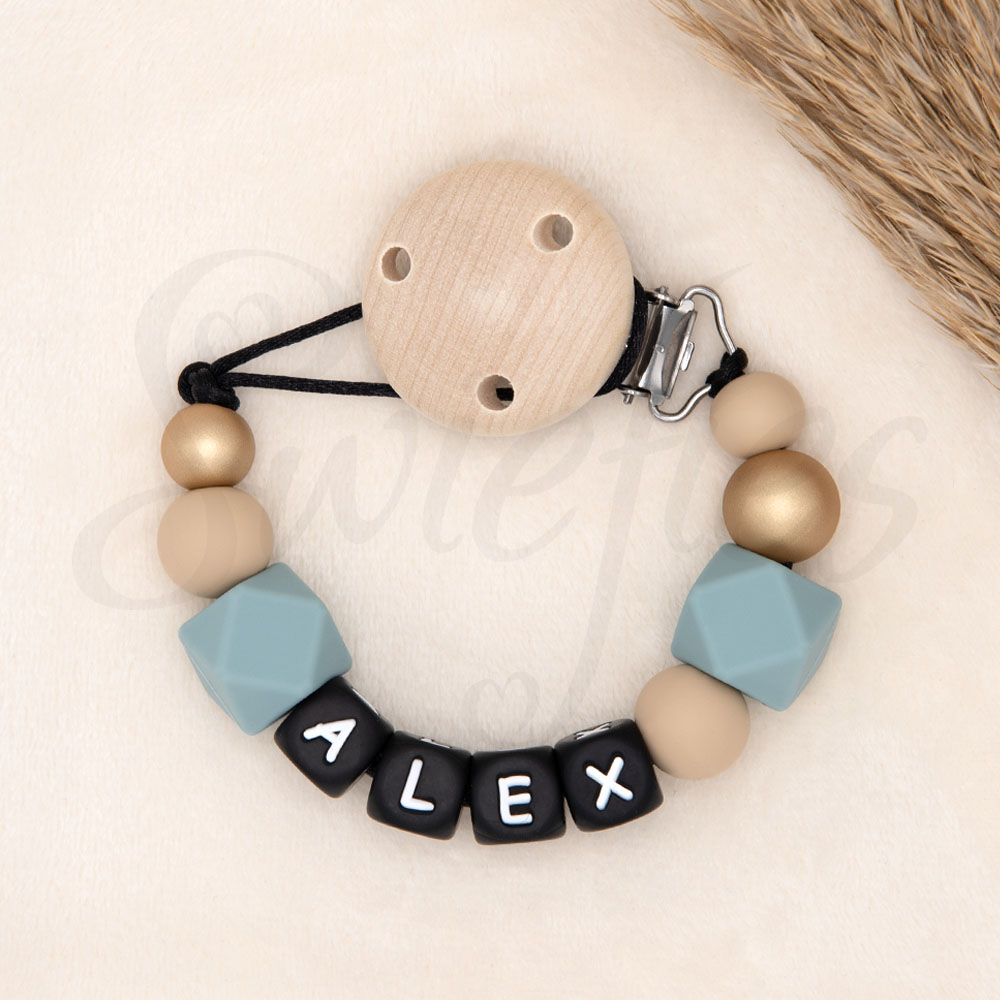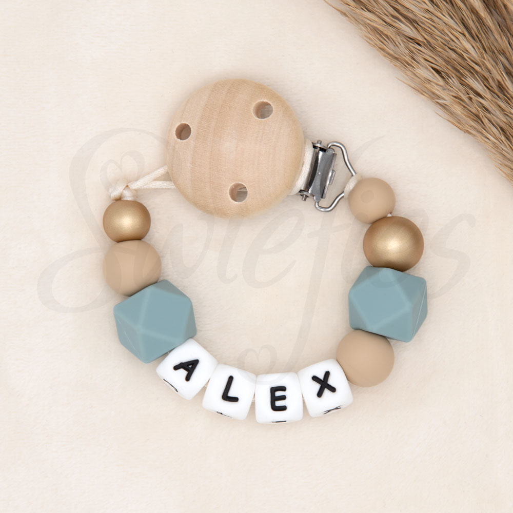 De samenstelling van dit speenkoord kan veranderen bij een naamlengte groter dan 4 letters. Heeft jouw kindje een lange naam? Dan zal Swiefies enkele kralen moeten vervangen voor een letterkraal i.v.m. de maximale veiligheidslengte van 22 cm. Om diezelfde reden hanteert Swiefies een maximum van 6 letters per speenkoord. Is de naam van jouw kindje langer dan 6 letters, dan adviseert Swiefies slechts een deel van de naam of alleen de eerste letter van de naam te gebruiken. We proberen uiteraard altijd de stijl van het speenkoord zoveel mogelijk te behouden!