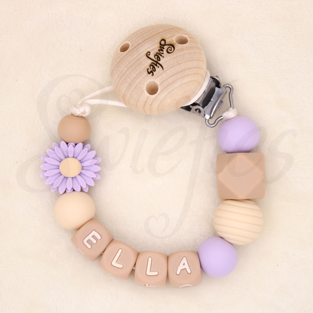 Op zoek naar een mooi en veilig speenkoord met naam voor je kleintje? Ontdek het gepersonaliseerde speenkoord met neutrale tinten en lila bloemetje van Swiefies! Dit stijlvolle accessoire zorgt ervoor dat de speen altijd binnen handbereik blijft en is perfect als kraamcadeau. Dankzij de mogelijkheid om het speenkoord volledig naar wens aan te passen, creëer je een uniek en persoonlijk cadeau voor elke baby.