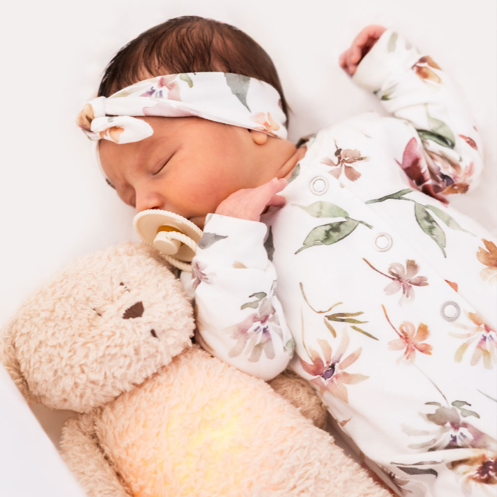 Het boxpakje Florance is een Off-White (gebroken wit) boxpakje bedrukt met mooie bloemen. Verkrijgbaar in maat 50 t/m 68 en te combineren met het haarbandje en/of mutsje Florance.
