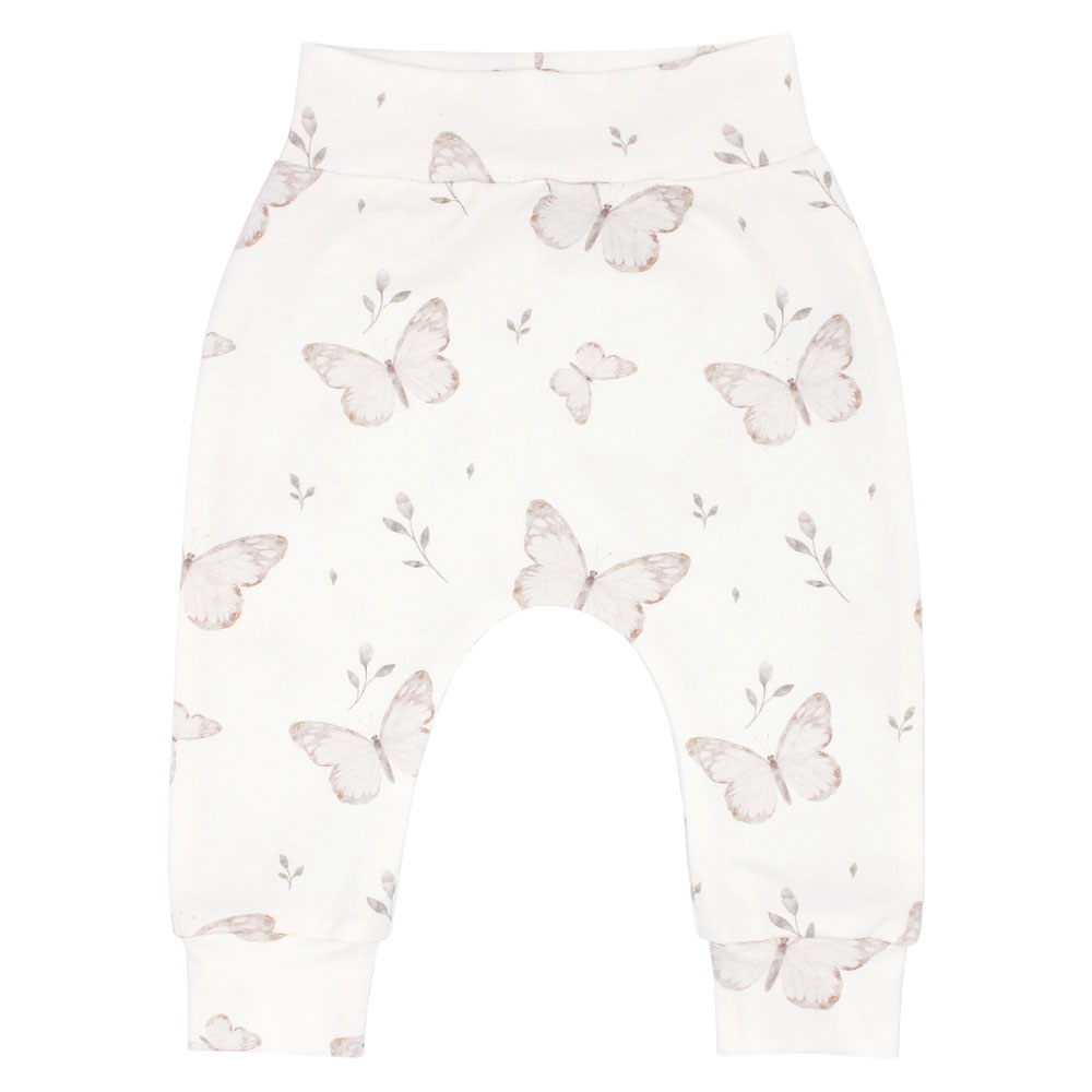 Het broekje Dinosaur is een off-white (gebroken wit) baggy broekje bedrukt met vlinders en kleine bloemetjes. Dit broekje is afgewerkt met brede boordjes aan de onderkant en een brede en comfortabele tailleband. Hij voelt zacht aan en is rekbaar om vrij en comfortabel in te slapen en bewegen.