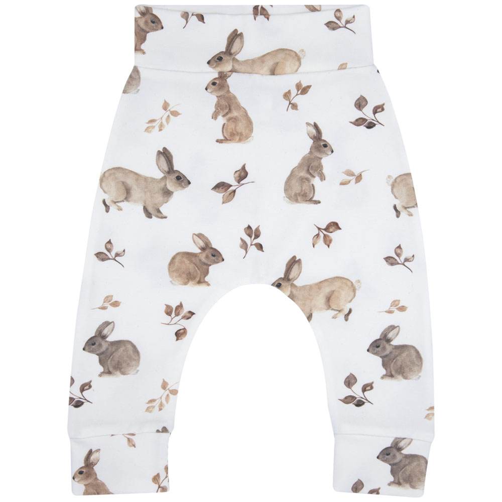 Het broekje Rabbit & Leaves is een off-white (gebroken wit) baggy broekje bedrukt met bruine konijntjes en blaadjes. Dit broekje is afgewerkt met brede boordjes aan de onderkant en een brede en comfortabele tailleband. Hij voelt zacht aan en is rekbaar om vrij en comfortabel in te slapen en bewegen.