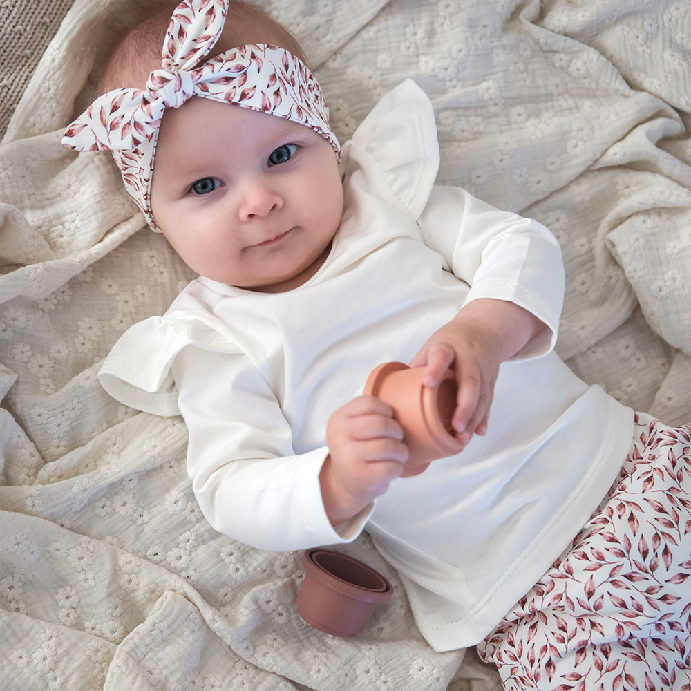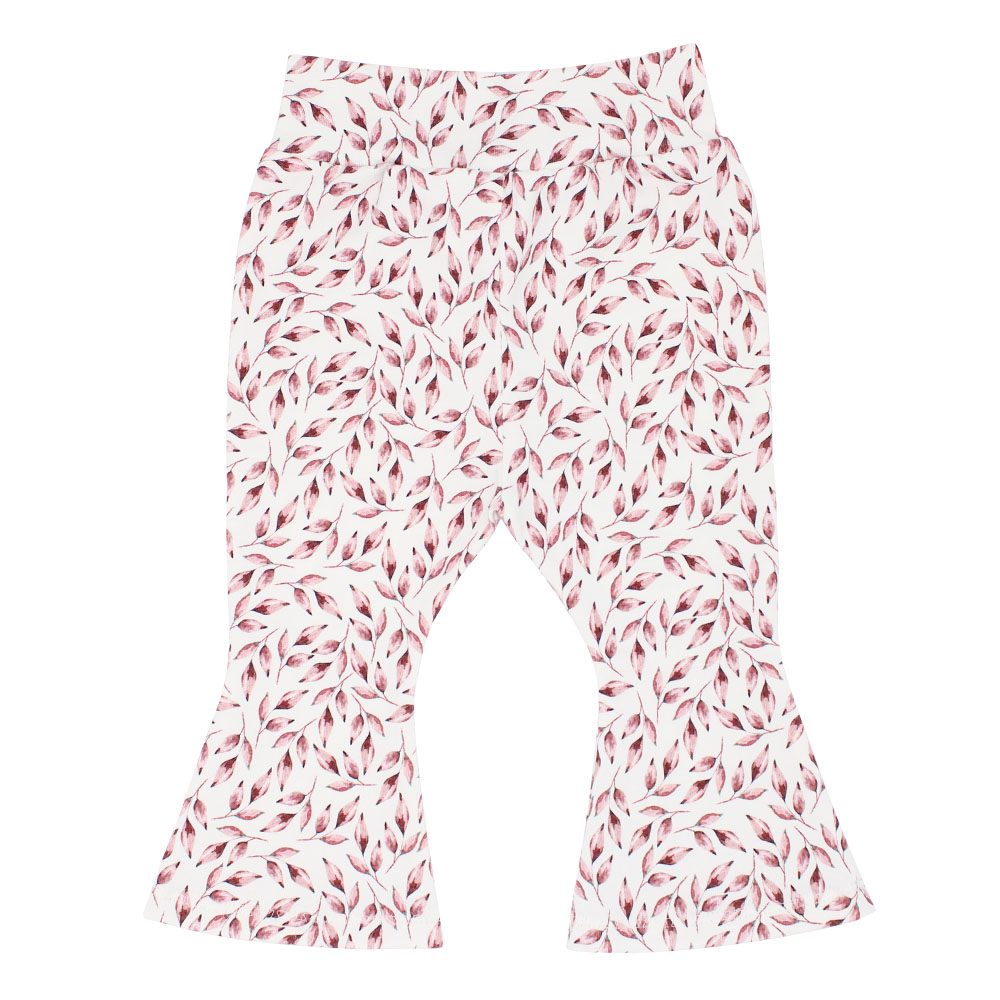 Het Flared broekje Pink Leaves is een Off-White (gebroken wit) broekje bedrukt met roze geschilderde bladeren. Het broekje valt als een legging en heeft wijd uitlopende pijpen. De taille is afgewerkt met een brede en comfortabele tailleband. Verkrijgbaar in de maat 50 t/m 80 en te combineren met het shirtje Old Pink en het haarbandje en/of mutsje Pink Leaves.