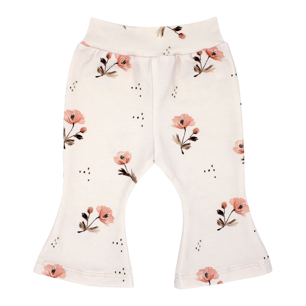 Het flared broekje Poppy is een zandkleurig broekje bedrukt met zalmroze klaproosjes. Het broekje valt als een legging en heeft wijd uitlopende pijpen. De taille is afgewerkt met een brede en comfortabele tailleband. Verkrijgbaar in de maat 50 t/m 86. Je kunt het broekje bijvoorbeeld combineren met het shirtje Sand of Taupe en het haarbandje en/of mutsje Poppy.