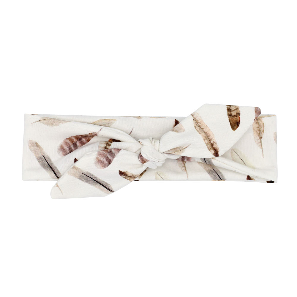 Het haarbandje Feathers is een Off-White (gebroken wit) haarbandje bedrukt met natuurlijke veren en is eenvoudig door uzelf te knopen. Het haarbandje is geschikt voor kindjes tot ongeveer 1 jaar en te combineren met het boxpakje en/of broekje Feathers.
