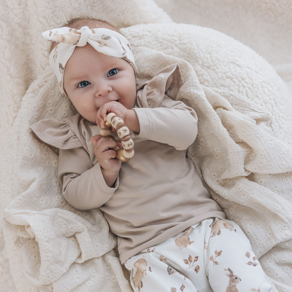 Het haarbandje Rabbit & Leaves is een Off-White (gebroken wit) haarbandje bedrukt met bruine konijntjes en blaadjes en is eenvoudig door uzelf te knopen. Het haarbandje is geschikt voor kindjes tot ongeveer 1 jaar en te combineren met het boxpakje en/of broekje Rabbit & Leaves.