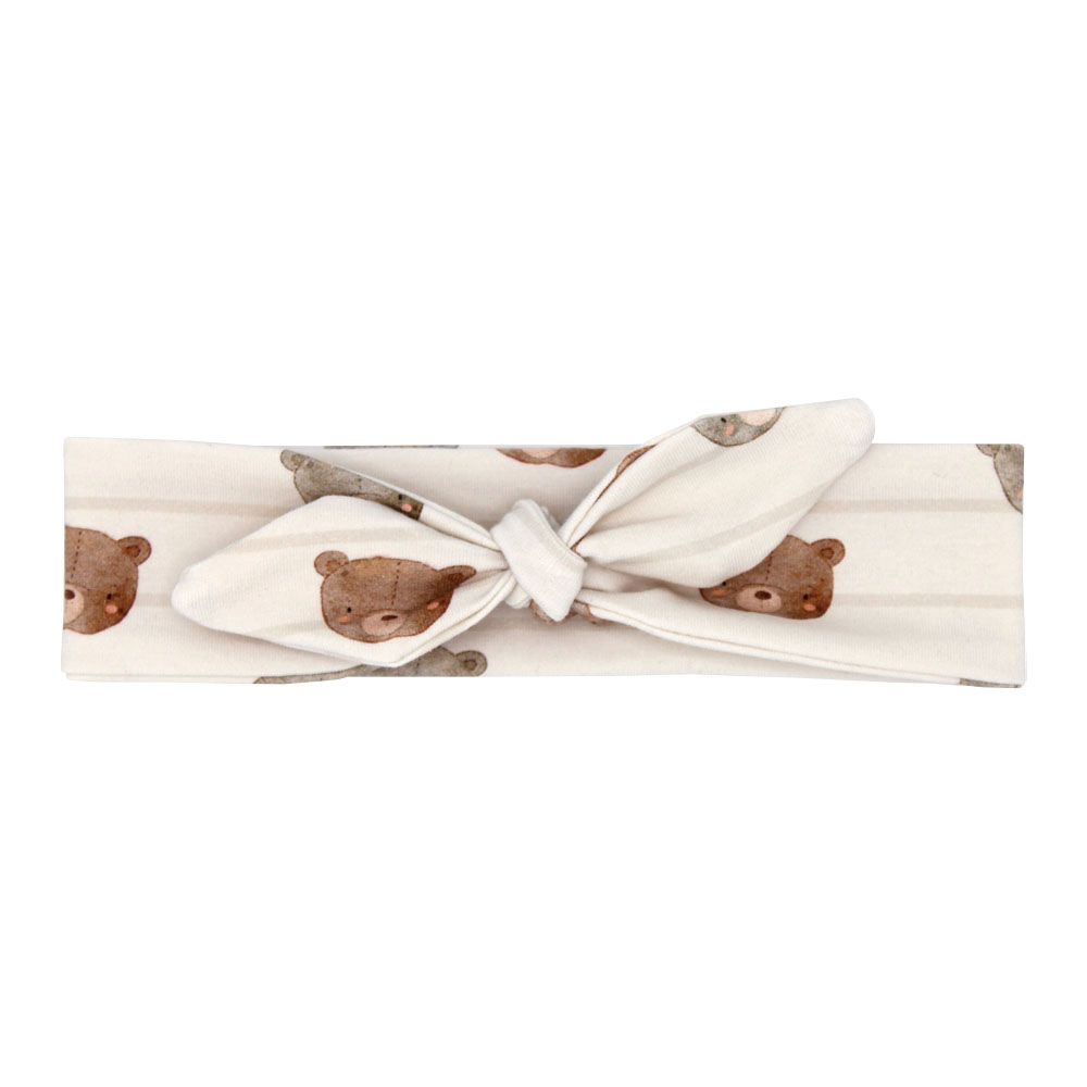Het haarbandje Teddy Stripes is een crèmekleurig haarbandje bedrukt met Teddybeertjes. Dit haarbandje is eenvoudig door uzelf te knopen. Het haarbandje is geschikt voor kindjes tot ongeveer 1 jaar en te combineren met het boxpakje en/of broekje Teddy Stripes en bijvoorbeeld het shirtje Sand of Taupe.
