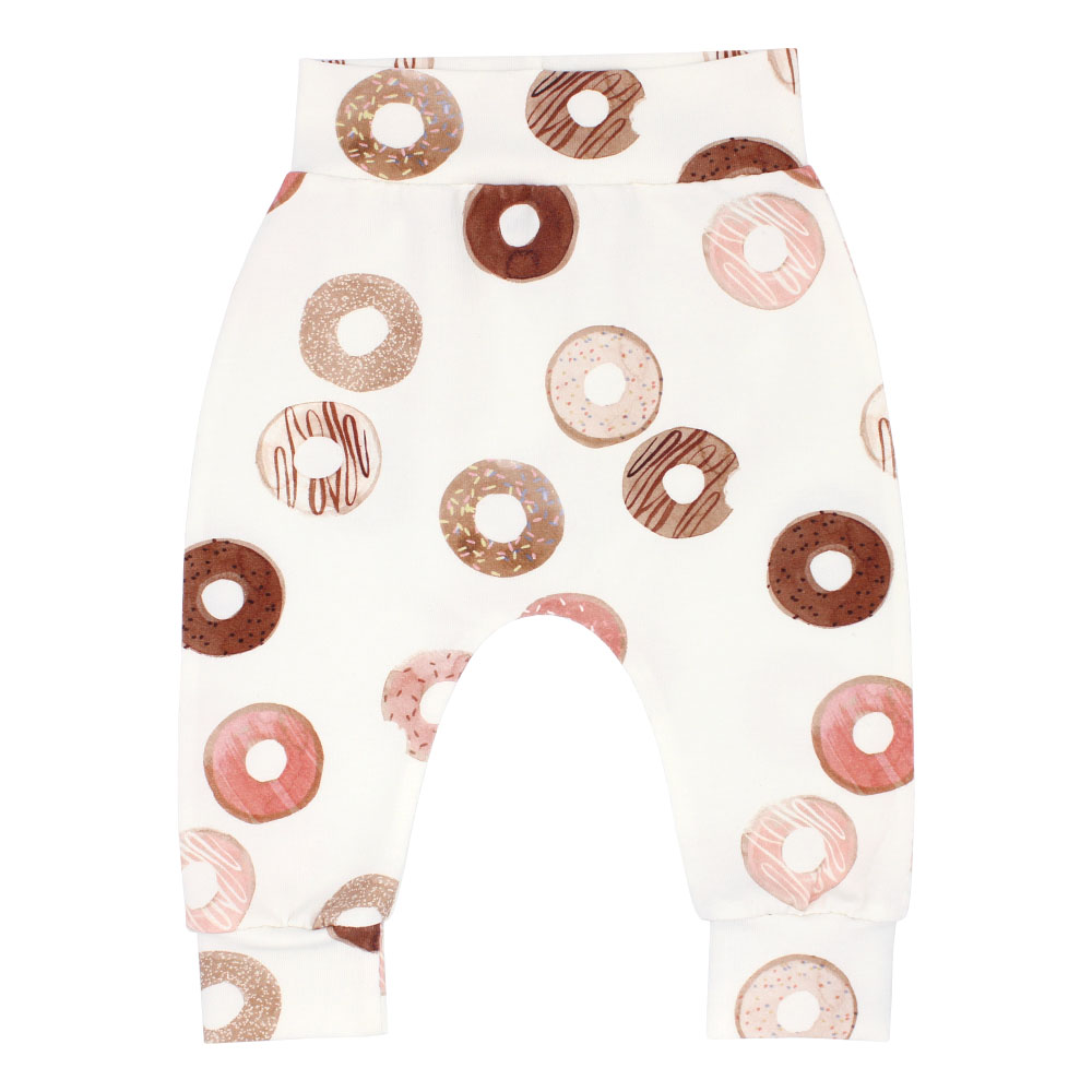 Het broekje Donuts is een off-white (gebroken wit) baggy broekje bedrukt met donuts. Dit broekje is afgewerkt met brede boordjes aan de onderkant en een brede en comfortabele tailleband.