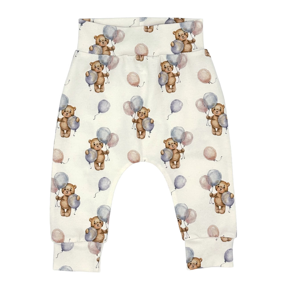Het broekje Partybear is een Off-White (gebroken wit) baggy broekje bedrukt met teddybeertjes & ballonnen. Verkrijgbaar in de maat 50 t/m 80 en te combineren met het haarbandje en/of mutsje Partybear.