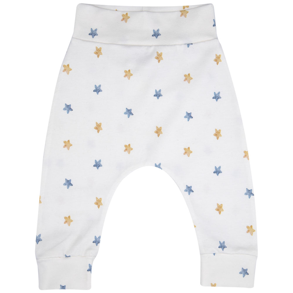 Het broekje Twinkle Stars is een Off-White (gebroken wit) baggy broekje bedrukt met kleine blauwe en gele sterretjes. Verkrijgbaar in maat 50 t/m 80 en te combineren met het haarbandje en/of mutsje Twinkle Stars.