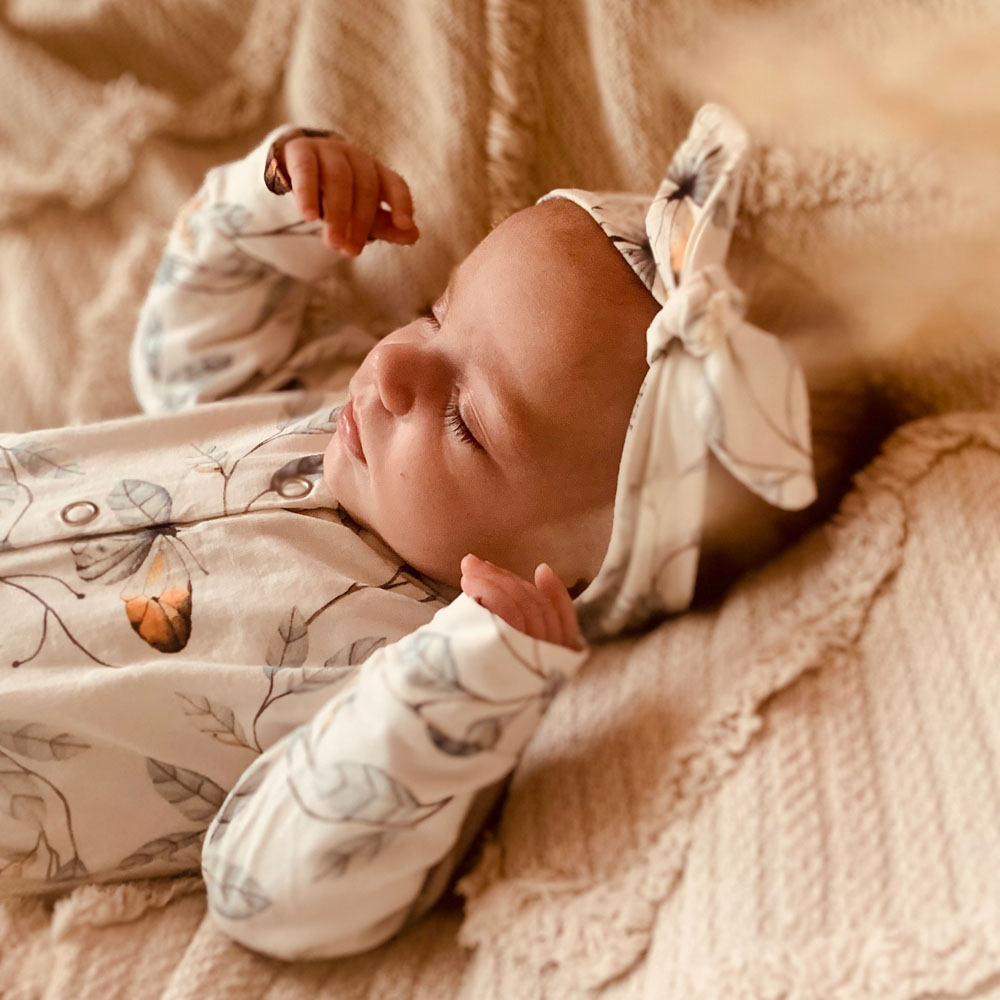 Het haarbandje Butterflies & Leaves is een Off-White (gebroken wit) haarbandje bedrukt met vlinders en bladeren en is eenvoudig door uzelf te knopen. Het haarbandje is geschikt voor kindjes tot ongeveer 1 jaar en te combineren met het boxpakje en/of broekje Butterflies & Leaves.
