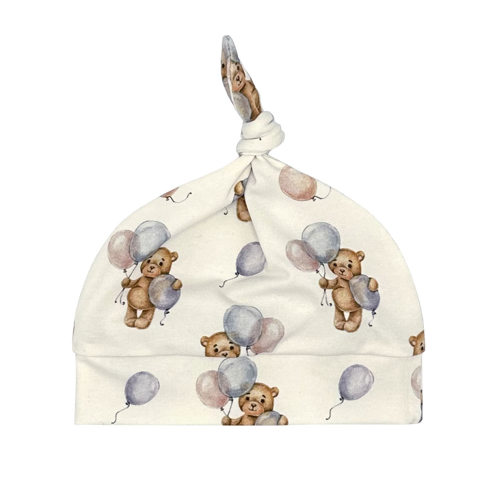Het mutsje Partybear is een Off-White (gebroken wit) knoopmutsje bedrukt met teddybeertjes & ballonnen. Dit mutsje heeft een knoopje bovenop waarmee u zelf eenvoudig de maat iets kunt verstellen. Verkrijgbaar in één maat: maat 50/56 en te combineren met het boxpakje en/of broekje Partybear.